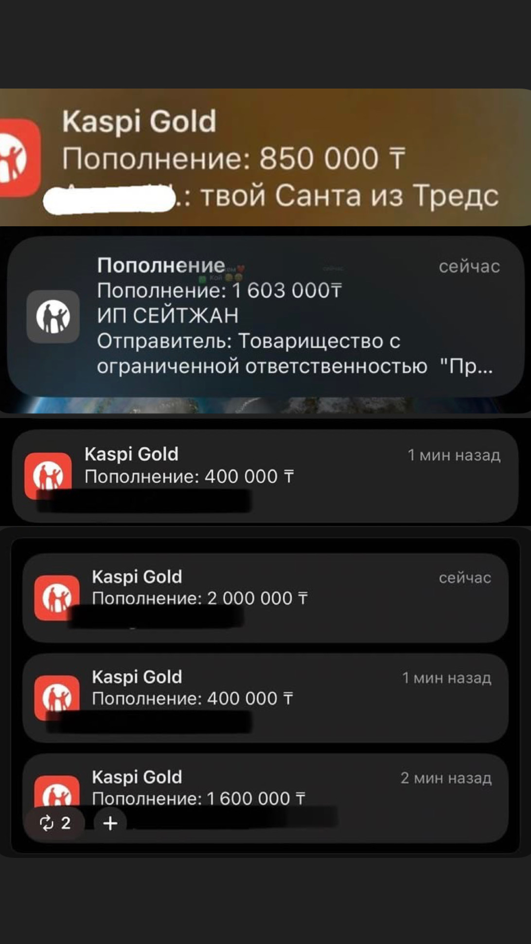 On social media, Kazakh citizens are sharing screenshots from banking apps showing money received in their accounts. Some photos show deposits of tens of thousands of tenge, while others show amounts exceeding one million tenge. Users are encouraging each other to participate in a cash “Secret Santa” game, transferring money to one another as a way to increase income, reports Nur.kz.