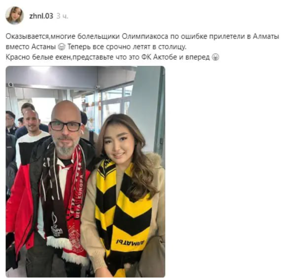 A group of Greek “Olympiacos” fans mistakenly flew to Almaty instead of Astana for their team’s match, local fans reported on the Threads social network. The travelers realized their error only after landing and are now reportedly rushing to the capital.