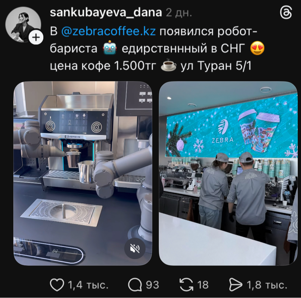 Астанадағы кофеханалардың бірінде кофе дайындау процесін толықтай өз мойнына алатын робот-бариста пайда болды: ол сусынды әзірлейді, кілегейді көпіршітеді, латте-арт (көбікке сурет салу) жасайды, тіпті артынан ыдыстарын да жуып қояды. Threads пайдаланушысы бейнежазбалармен бөлісті.